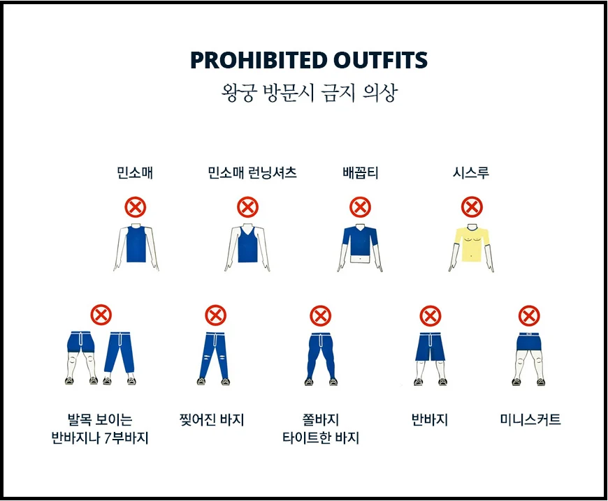 왕궁 복장 규정 참고 부탁드립니다. 왕궁 입장 불가한 복장으로 오셔서 현장에서 입장 거부될 경우 책임지지 않습니다. (현장 대여 불가능)